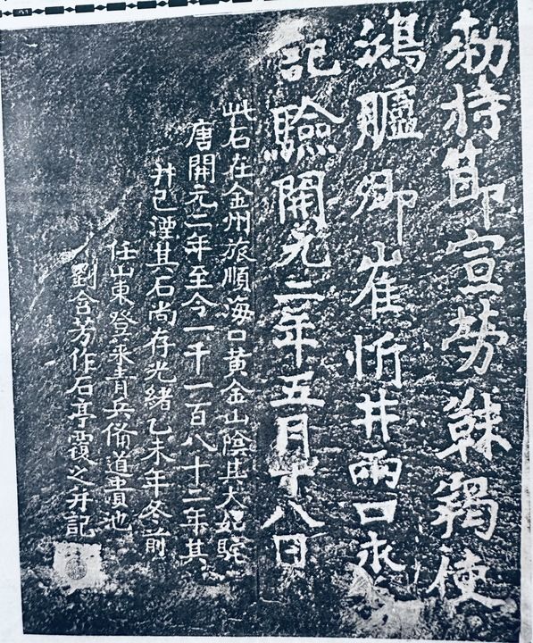 早在1911年,大连本地乡绅乔德秀在《南金乡土志》中首次记载了唐鸿胪井碑被日本非法掠夺的历史。1936年,古文字学家罗福颐在其编撰的《满洲金石志稿》中,对刻石的位置、题刻内容、题刻缘由等内容进行了较为详细的描述,并收录了题刻的拓片。